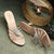 Add a sparkling touch to your festive ensemble with these Rose Gold slip-on ethnic heels by Valentino. Adorned with crystal-studded straps and a statement jewel in the heel, these open-toe slip ons are perfect for weddings, parties, and traditional occasions.